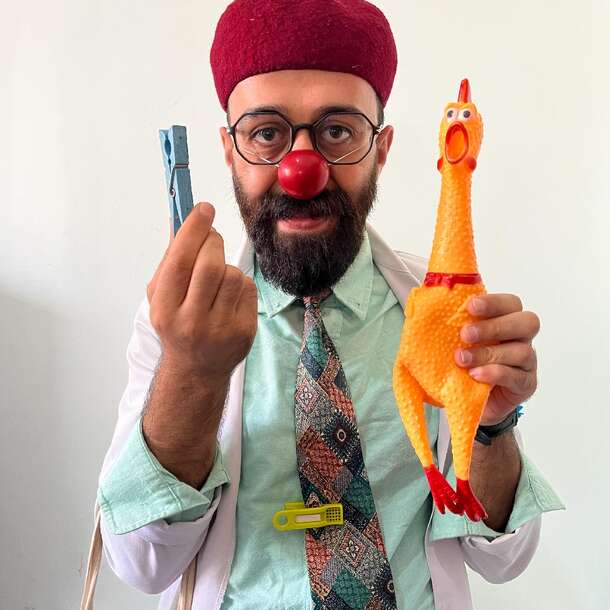 My mother gave birth to me on the clothesline, and one of my greatest hobbies is carrying the laundry basket, and waiting for it to dry...I love to dance and sing especially folklore songs as it allows me to shake my hips... I adore colorful things... I get really shy when people look at me, especially girls, as they don’t know I am in a committed relation with washing tongs... I forget a lot, which makes a lot of mess and I love it that way ..I never manage to stand still and quiet... I want to make children laugh together with my chicken companion, Husni, who is always with me so I don't feel lonely.